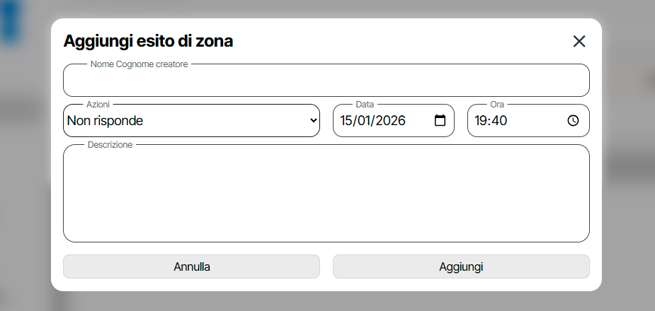 La principale differenza rispetto agli altri esiti consiste nella compilazione automatica dei campi Data e Ora, valorizzati con il momento esatto dell’inserimento, assicurando rapidità e precisione nella registrazione.