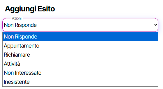 Gli Esiti sono suddivisi in sei diverse tipologie, ciascuna delle quali identifica un’azione specifica o una risposta ricevuta dall’anagrafica di riferimento. Nell’interfaccia del software, è possibile selezionare il tipo di Esito appropriato, garantendo una registrazione accurata di ogni interazione.