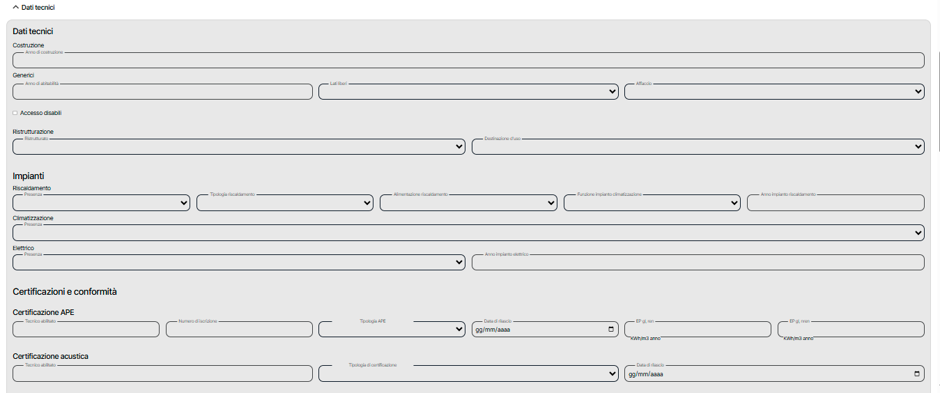La sezione Dati Tecnici consente di registrare e gestire tutte le informazioni tecniche relative all’immobile, essenziali sia per valutazioni precise sia per adempimenti contrattuali.