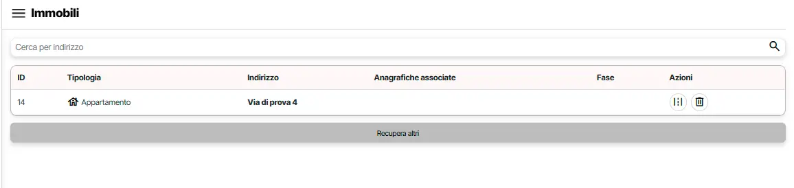 Sopra la tabella degli immobili sono presenti filtri che consentono di affinare la ricerca in base a Fase e Tipologia. È possibile selezionare una o più opzioni per visualizzare esclusivamente gli immobili corrispondenti ai criteri impostati, facilitando l’organizzazione e la gestione dei dati.