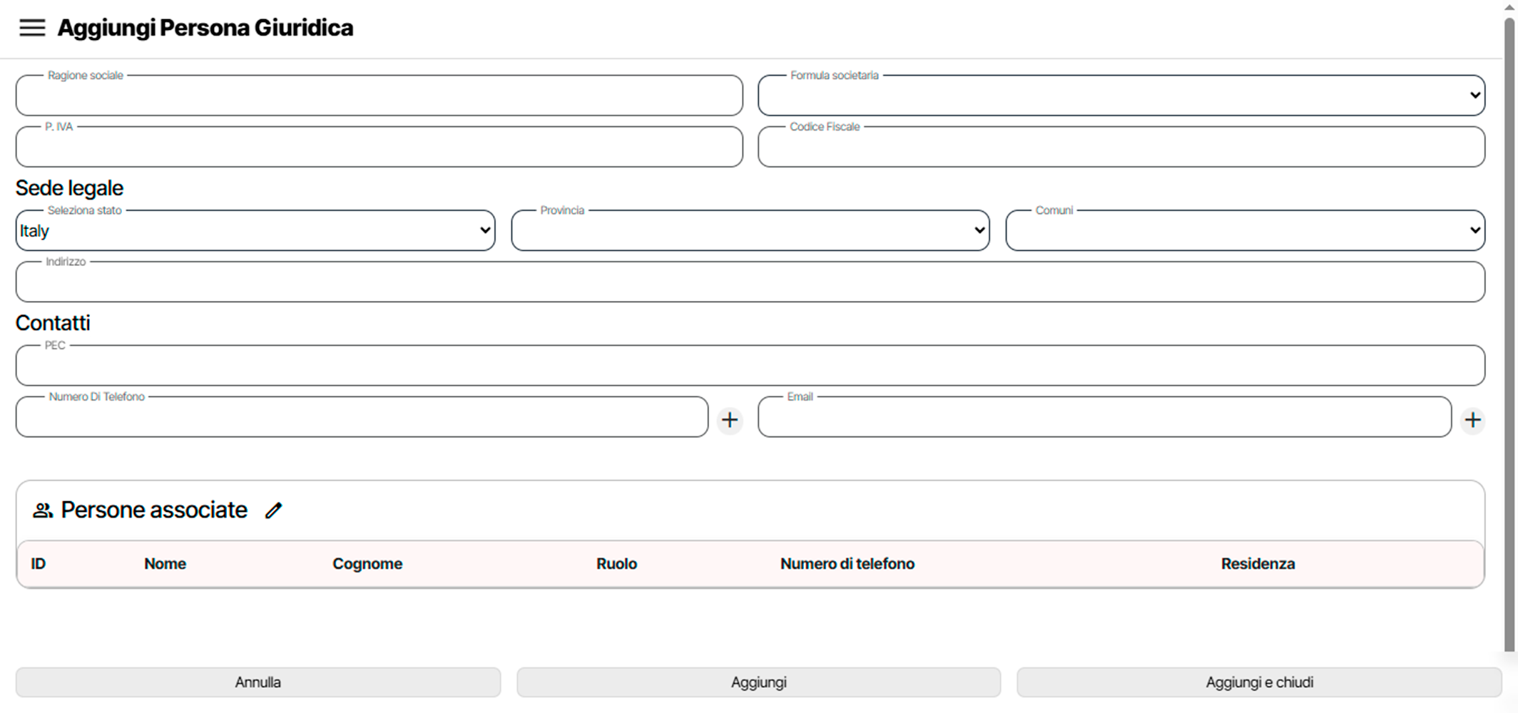 La Persona Giuridica rappresenta un’azienda o entità legale e consente anche di associare persone fisiche già presenti nel software.